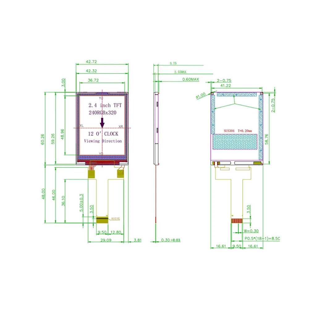 1. Описание: Это 2,4 дюймовый сенсорный ЖК-экран 240*320 TFT. 2. Особенности: 1>. Сенсорный экран 2>.4Pin SPI связь 3>. Регулируемое направление отображения 4>. 12-часовой дисплей с углом обзора 3. Параметры: 1>. Название продукта: 2,4 дюймовый сенсорный ЖК-экран 240*320 TFT 2>. Материал: цветной ЖК-экран TFT 3>. Разрешение: 240*320 4>. Чип драйвера: ILI9341 5>. Размер дисплея: 2,4 дюйма 6>. Площадь дисплея: 36,72*48,92 мм 7>. Размер панели: 42,72*60,26*3,75 мм 8>. Тип интерфейса: 4-контактный SPI 9>. Рабочее напряжение: 2,8 В-3,3 В 10>. Штифты: 0,5 мм 18Pin 11>. Вид: 12 часов 12>. Рабочий ток: 60 мА 13>. Рабочая мощность: 0,22 Вт 14>. Тип подсветки: 4 шт LED 15>. Диапазон рабочих температур:-20 ℃ ~ 70 ℃ 16>. Диапазон рабочей влажности: 5%-95% RH 4. Определение контактов: 1>.Pin-1:GND.Power GND. 2>.Pin-2: сброс. Устройство сброса. 3>.Pin-3:SCL. pin-код часов. 4>.Pin-4:D/C. Данные и команда select pin. 5>.Pin-5:CSX. Микросхема select pin. Низкий уровень включается и высокий отключается. 6>.Pin-6:SDA. Ввод данных pin. 7>.Pin-7:SDO. Вывод данных. 8>.Pin-8:GND.Power GND. 9>.Pin-9:VDD. Рабочая мощность VCC. 10>.Pin-10:LEDA. Подсветка VCC. 11>.Pin-11: led1.подсветка GND. 12>.Pin-12: led2.подсветка GND. 13>.Pin-13: led3.подсветка GND. 14>.Pin-14: led4.подсветка GND. 15>.Pin-15:XL(X-). Логический контакт с сенсорной функцией. 16>.Pin-16:XU(Y-). Логический контакт с сенсорной функцией. 17>.Pin-17:XR(X +). Логический контакт с сенсорной функцией. 18>.Pin-18:XD(Y +). Логический контакт с сенсорной функцией. 5. Применение: 1>. Дисплей прибора 2>. Мобильные устройства 3>. Износостойкое устройство отображения 4>. Оборудование для мониторинга и отображения в реальном времени 6 посылка 1>.1 шт. 2,4 дюйма 240*320 TFT ЖК сенсорный экран