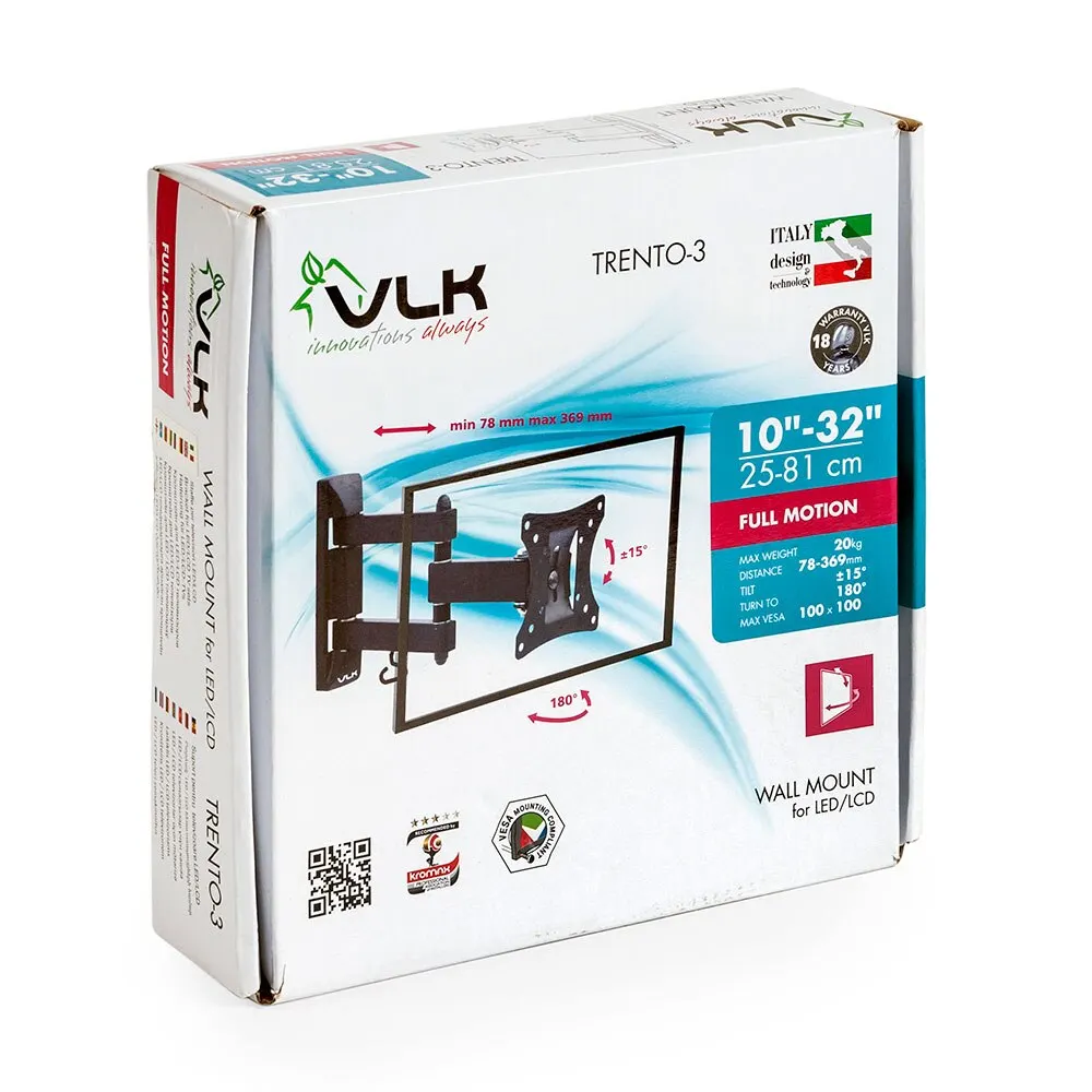 Наклонно - поворотный кронштейн VLK TRENTO-3 предназначен для всех LED/LCD телевизоров с диагональю экрана от 10 до 32 дюймов (25-81 см). Изготовлен из высококачественной стали и способен выдерживать нагрузку до 20 кг. Многофункциональное крепление VLK TRENTO-3 позволит наклонять и поворачивать экран Вашего ТВ, в так же сдвигать и отодвигать его от стены, при помощи двух коленной конструкции. Идеальное решение для монтажа в угол комнаты.