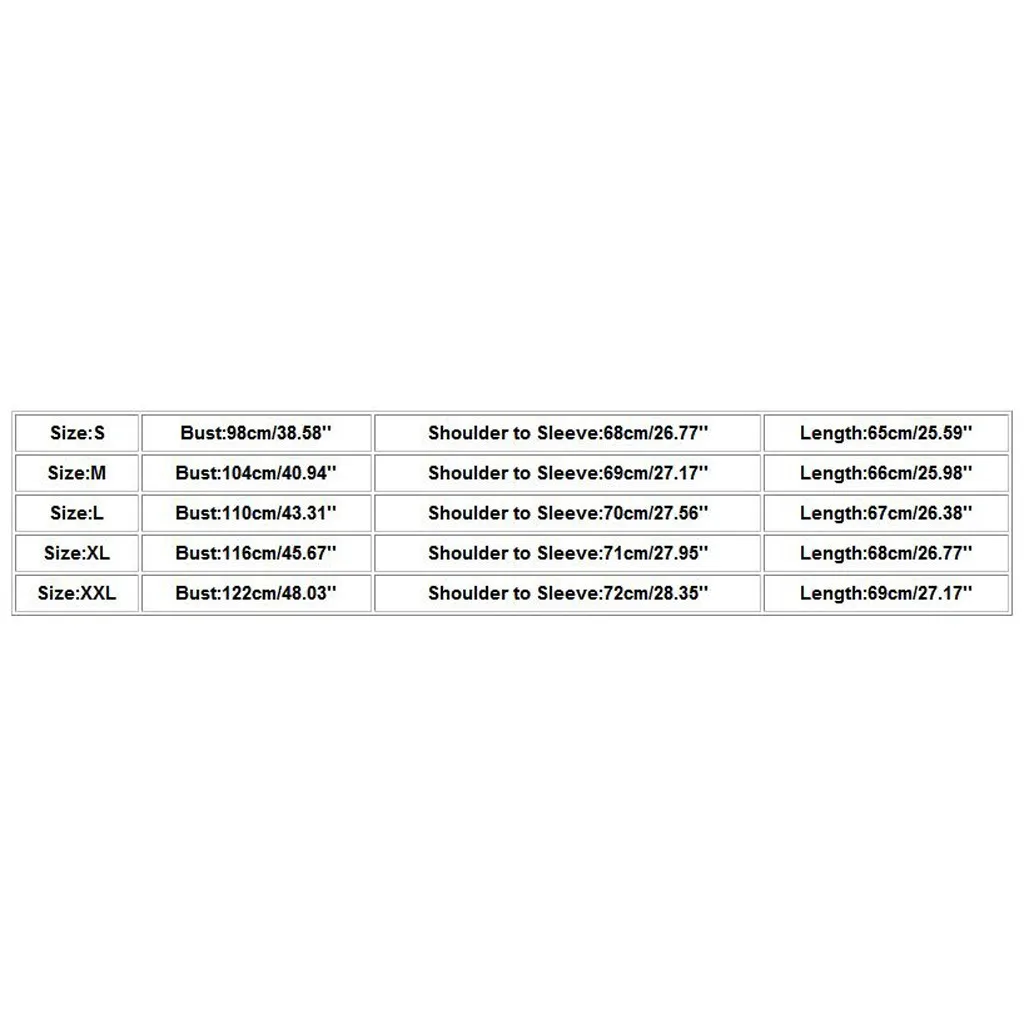 Size Bust Shoulder to Sleeve Length S 98cm/38.58'' 68cm/26.77'' 65cm/25.59'' M 104cm/40.94'' 69cm/27.17'' 66cm/25.98'' L 110cm/43.31'' 70cm/27.56'' 67cm/26.38'' XL 116cm/45.67'' 71cm/27.95'' 68cm/26.77'' XXL 122cm/48.03'' 72cm/28.35'' 69cm/27.17''