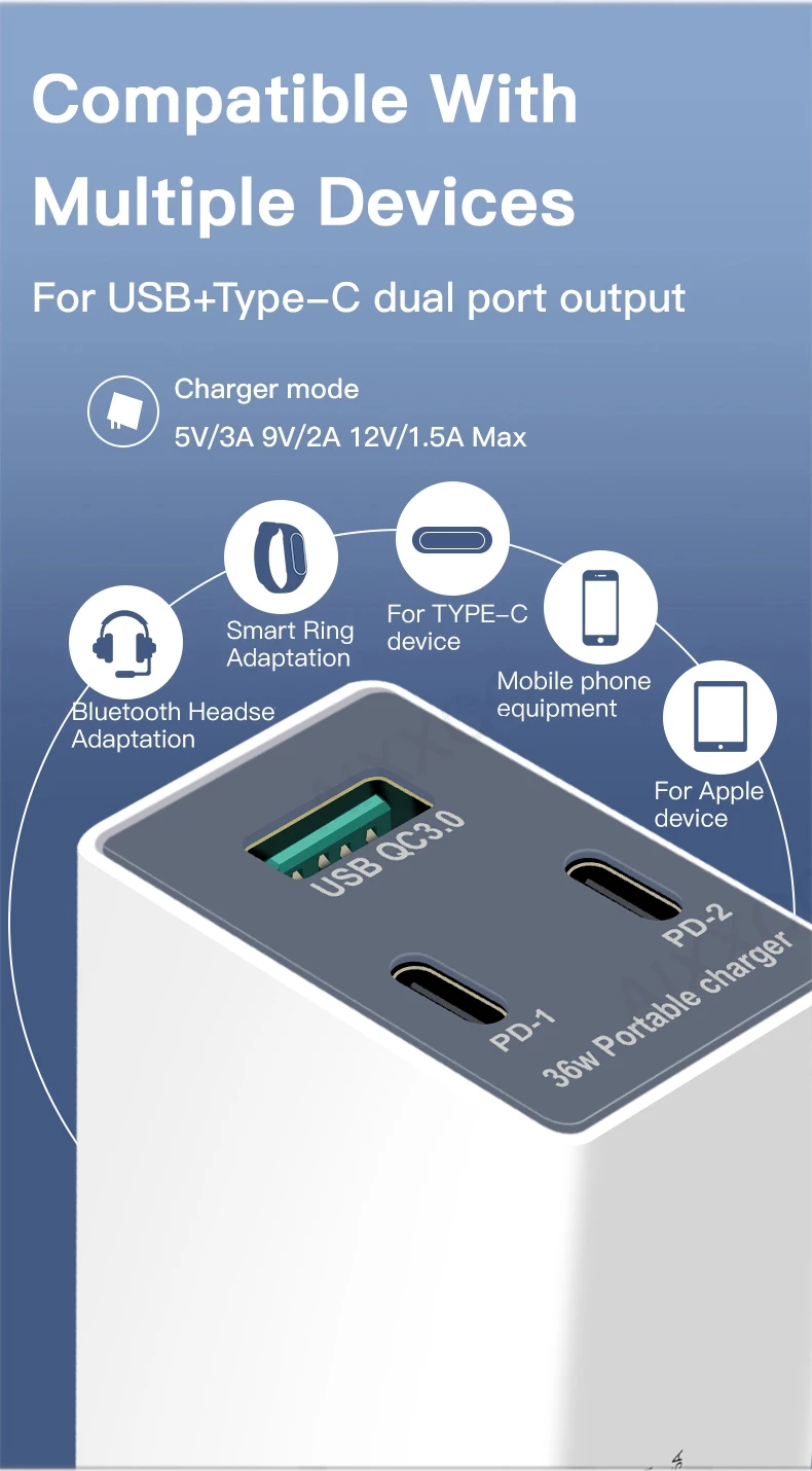 Параметры продукта: Информация о продукте Название продукта: быстрое зарядное устройство PD + QC3.0 Материал: PC + ABS Цвет: белый PD-1 порт: 5V3.6A/9V2A/12V1.5A PD-2 порт: 5V3.6A/9V2A/12V1.5A QC3.0 порт: 5V3.6A/9V2A/12V1.5A Размер: 95*45*29 мм Размер штепсельной вилки: 36 Вт (PD1 фиксированный 18 Вт, использование одного порта 18 Вт) Общая мощность: PD1 + PD2 = 36 Вт, PD1 + QC3.0 = 36 Вт, PD2 + QC3.0 = 18 Вт Фетр: 1. Быстрое зарядное устройство, 18 Вт двойной PD3.0 + 18 Вт QC3. 2. Компактный размер, легко носить с собой, легко упаковывать. 3. Нет вреда для телефона, быстрая зарядка имеет смысл. 4. Складные 90 ° градусов булавки, не царапают другое оборудование. 5. Складные 90 ° градусов булавки, не царапают другое оборудование. 6. Совместимость с несколькими устройствами, для выхода с двумя портами USB + Type-C. 7.Miltifunctional USB + PD socket, подходит для всех жизненных потребностей. (офисная зарядка, зарядка дома, переноска на человека)