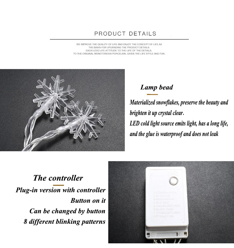 Продукт: светодиодный ная гирлянда из снежинок 6 м Цвет: тсветильник плый свет Питание от аккумулятора: 3 аа Размер: 6 м с 40 светодиодный ными снежинками Входное напряжение: 4,5 в Материал снежинки: ПВХ Применение: вечерние сад праздничного декора [Уникальный дизайн] 6 м 40 светодиодов, теплый белый Снежинка, ПВХ водонепроницаемый материал. Два цвета: теплый и красочный. Осветит темный угол, создавая атмосферу счастья в помещении или на улице. [Работает от батареек] требуется 3 батарейки типа АА. Так что он дает вам больше вариантов использования, и вам не нужно беспокоиться о розетке. На батарейном отсеке есть Переключатель ВКЛ/ВЫКЛ. [Безопасность] светодиодная гирсветильник да, которая не перегревается и не безопасна. После нескольких часов использования не нагревается, даже если вы прикасаетесь к нему. Медный провод гибкий и гибкий, что означает, что гирлянды можно согнуть до любой формы, которую вы хотите. [Водонепроницаемые светодиодные гирлянды для помещений/улицы] IP44, что позволяет использовать свет как внутри, так и снаружи. Однако питание и контроллер не являются водонепроницаемыми, пожалуйста, хорошо Защищайте их при использовании на открытом воздухе. [Идеальное украшение] гирлянды со звездами можно использовать как в помещении, так и на улице, например в виде рождественской елки, спальни, общежития, бара, окна, забора, галереи, патио, крыльца или беседки, они могут придать идеальную атмосферу любому пространству. Его также можно использовать в различных ситуациях: Рождество, день рождения, свадьба, фестиваль, выпускной, День Святого Валентина, модный показ и так далее.